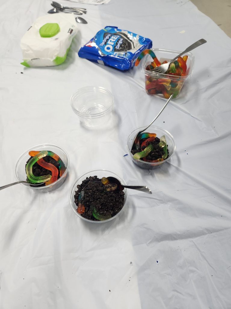 This week we made delicious treats of “Worms and Dirt” then got working on one of the many murals downstairs.