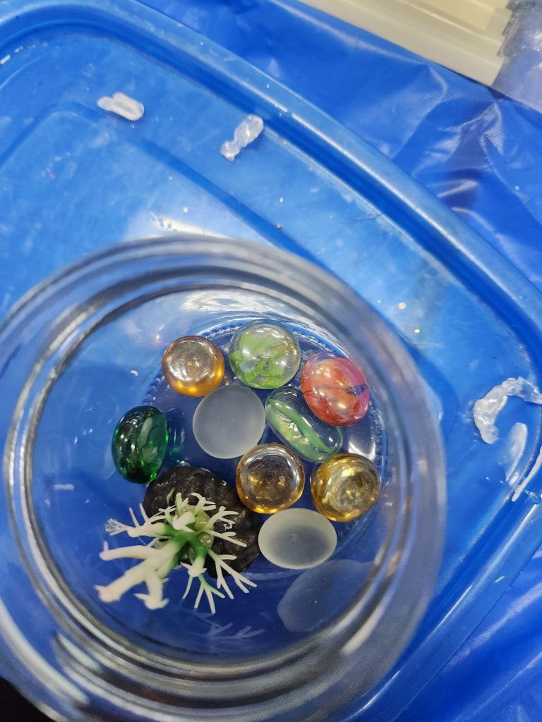 If you have aquarium plants or rocks glue them down with hot glue to the dry jar. This may be tricky and you might need help of an adult.
